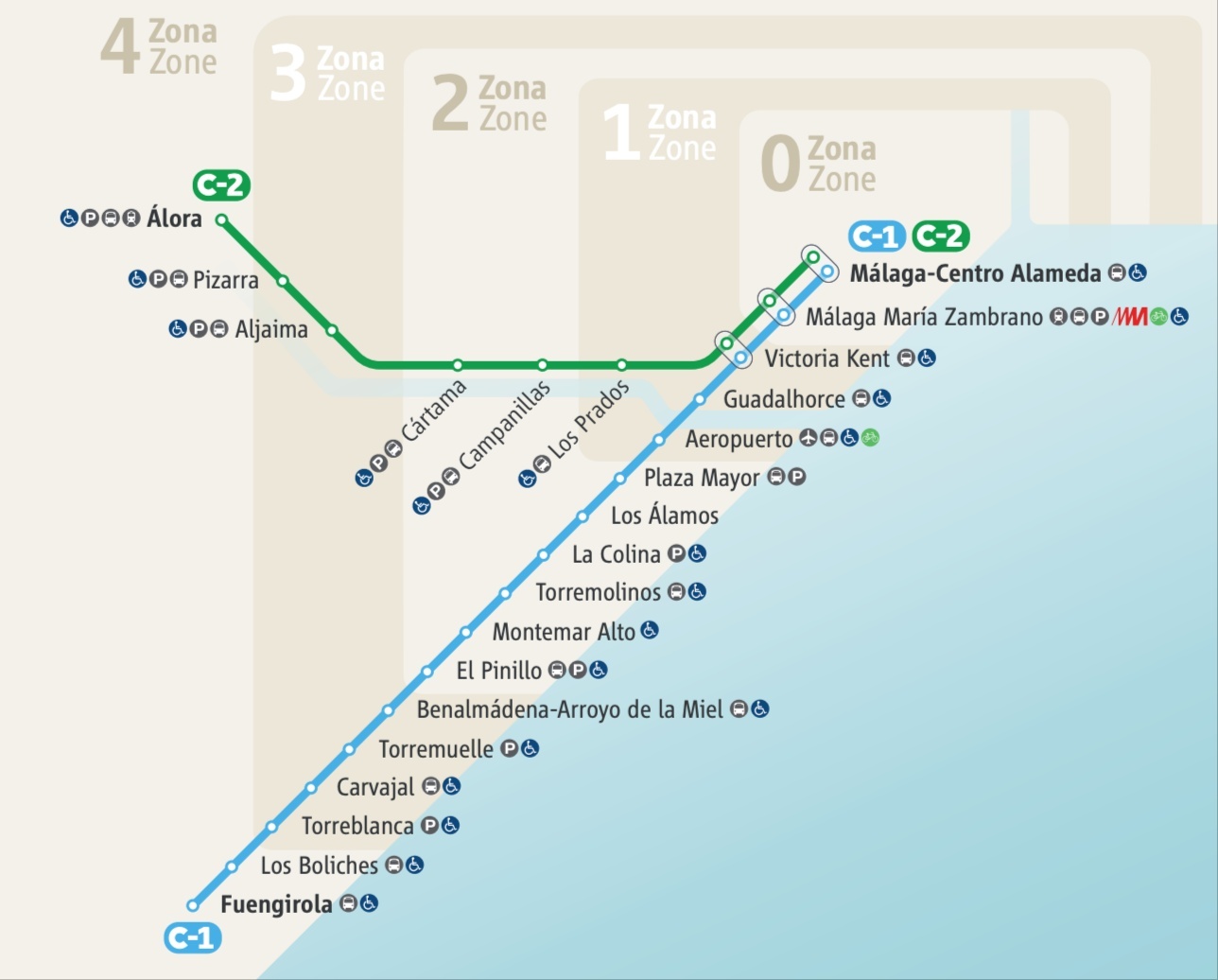 The C1 Cercanías line is the most useful piece of transport infrastructure on the Costa del Sol. It runs 31 kilometres along the western coastline from Málaga Centro-Alameda all the way to Fuengirola, stopping at 17 stations along the way — including Málaga Airport, Torremolinos, and Benalmádena.